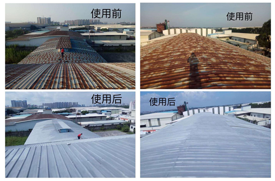工業(yè)廠房都是彩鋼瓦封頂,在使用數(shù)年后都會(huì)老化產(chǎn)生銹斑,不及時(shí)處理就會(huì)產(chǎn)生漏水穿孔等問題。需要及時(shí)進(jìn)行翻新,以往彩鋼瓦翻新使用的醇酸油漆都是要經(jīng)過除銹,刷防銹漆,再刷飾面漆,比較繁瑣,當(dāng)然工價(jià)也很貴,換瓦更是工價(jià)高,還得停工停產(chǎn),經(jīng)濟(jì)賬算來算去不劃算。并且過不了幾年又生銹,并且從里面生銹、脫層。